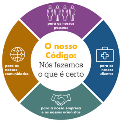 Nosso Código de Conduta está alinhado com os nossos valores e é nosso compromisso compartilhado de fazer o que é certo para as nossas pessoas, os nossos clientes e os seus pacientes, os nossos acionistas e as nossas comunidades. Nosso Código é como uma bússola: ele nos empodera a seguir em frente do jeito certo. Ao fazermos o que é certo, conquistamos confiança, expandimos nossos negócios e realizamos nossa missão.