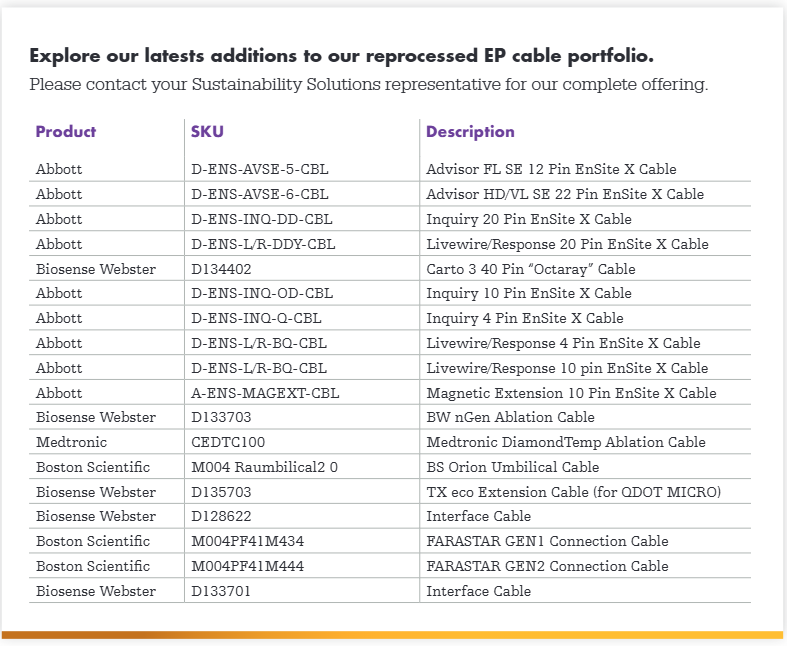 Reprocessed EP cables are a set of insulated wires, wrapped in a protective coating, with unique connectors on each end. Stryker's Sustainability Solutions (SSS) reprocessed EP cables are 100% visually inspected and reprocessing cycles are tracked. 1 Now available: Reprocessed FARASTAR GEN2 Connection cable and VARIPULSE Interface cable